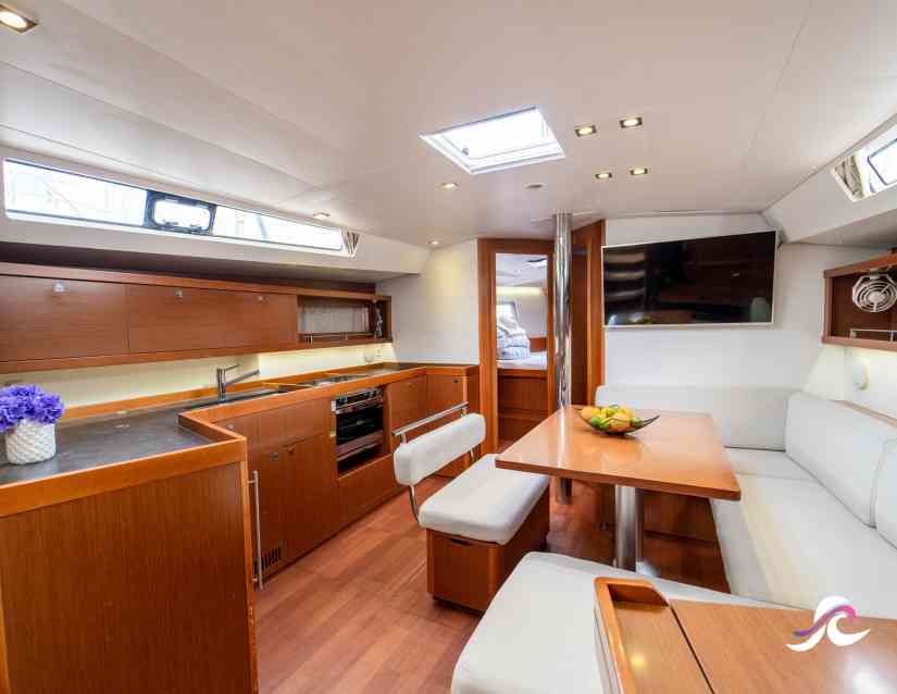 A companionway with a very gentle 45-degree slope permits easy access to the area below deck and leads into an elegant space featuring a portside L-shaped galley, a chart table and a starboard saloon that can accommodate 10 people.