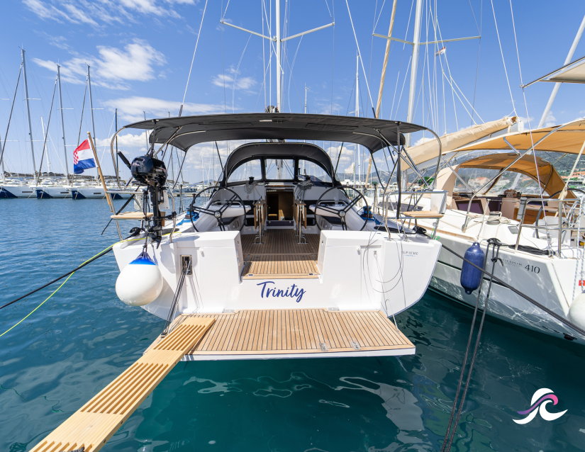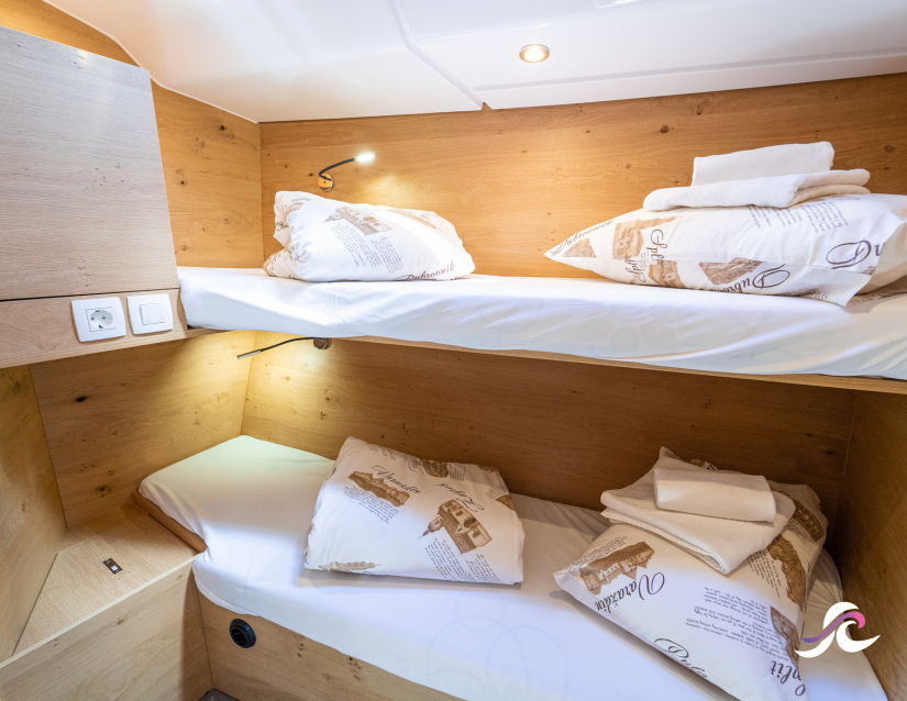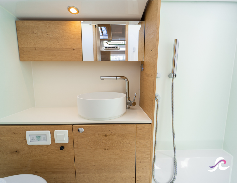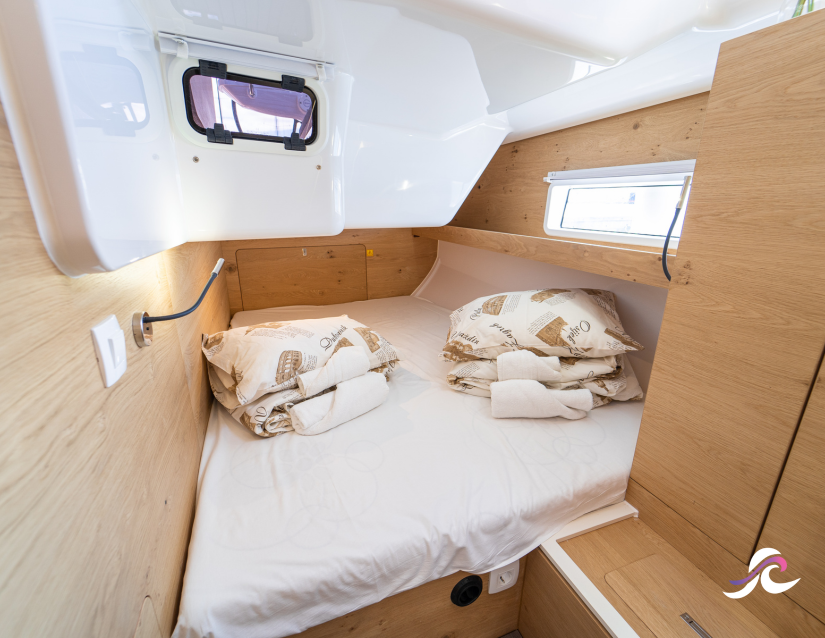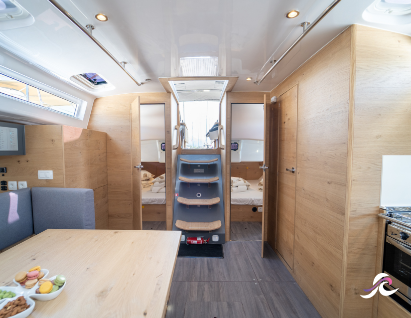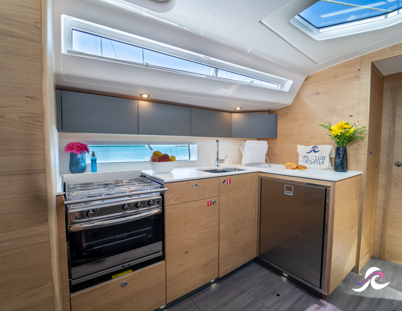 Elan yacht is designed with every comfort & enjoyment in mind – from sunbathing areas in cockpit and outdoor grill and fridge to extended seating area. This yacht offers much more space than previous models and makes her great choice for larger group of family or friends especially if you are looking for fully equipped yacht with air condition. The interior of the yacht is built with rustic oak veener and marine-grade plywood, contrasted with modern gray-coloured storage cupboards. The table in the saloon is convertible in the bed which is great advantage , but the crew can also seat comfortably around the central table if they rather choose to chill and hang out.