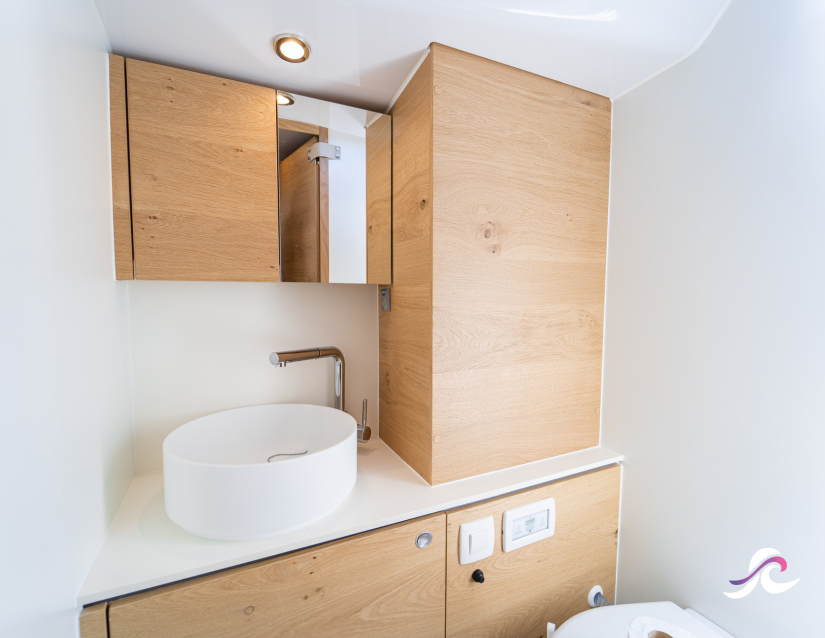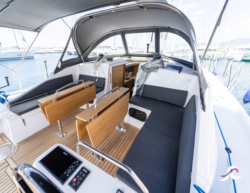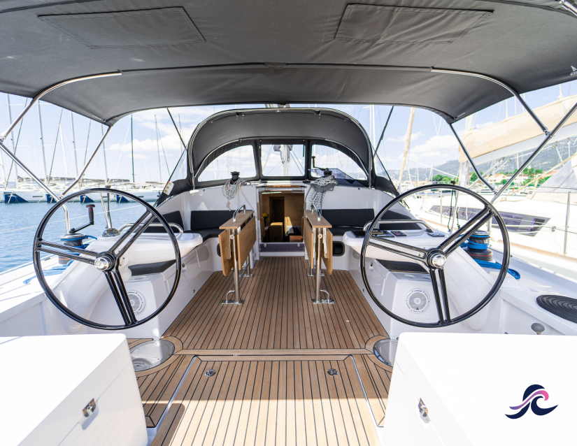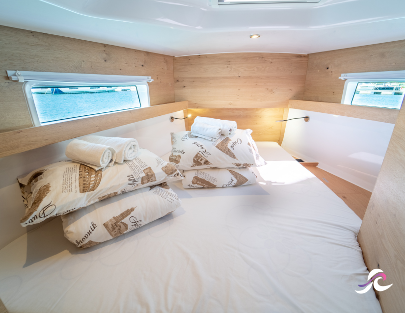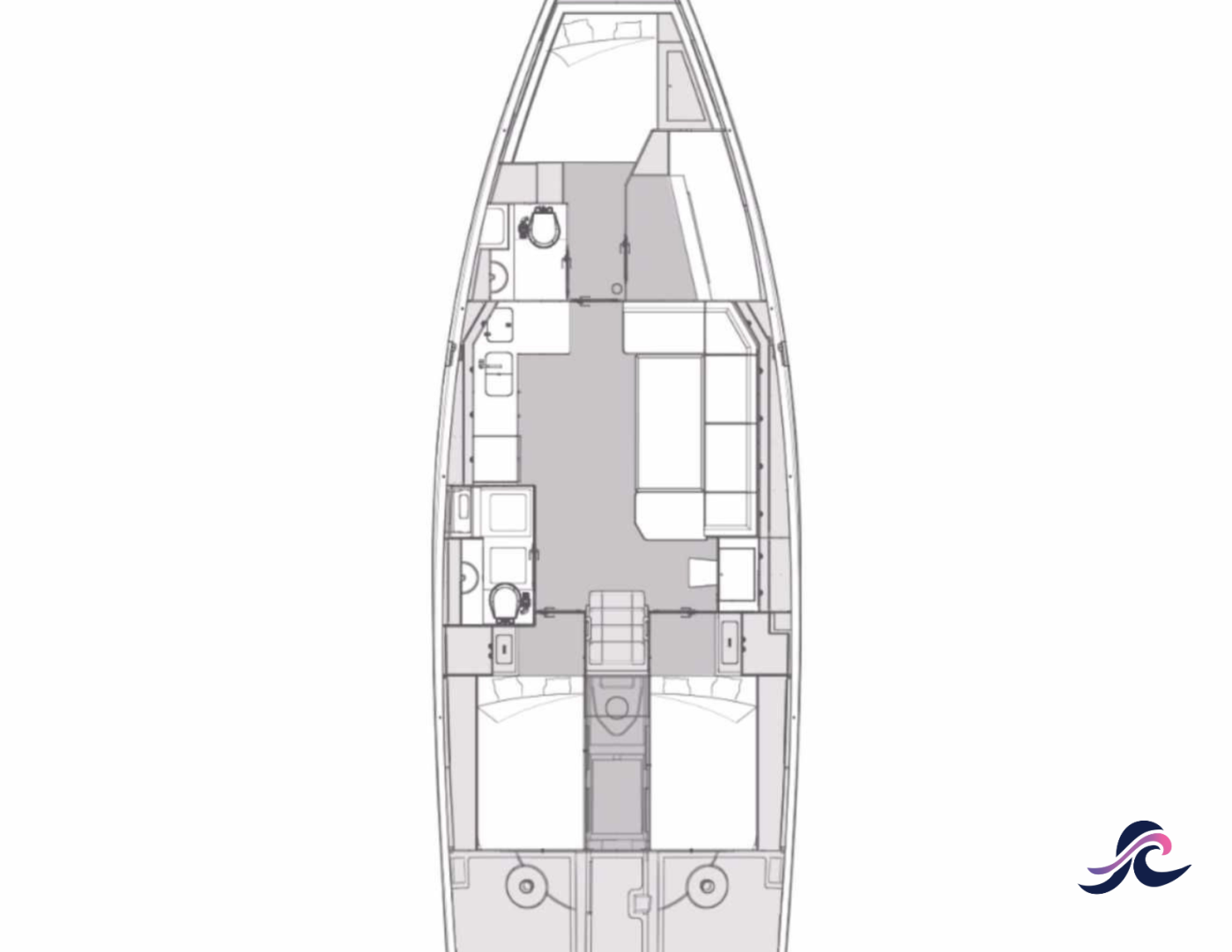 Elan yacht is designed with every comfort & enjoyment in mind – from sunbathing areas in cockpit and outdoor grill and fridge to extended seating area. This yacht offers much more space than previous models and makes her great choice for larger group of family or friends especially if you are looking for fully equipped yacht with air condition. The interior of the yacht is built with rustic oak veener and marine-grade plywood, contrasted with modern gray-coloured storage cupboards. The table in the saloon is convertible in the bed which is great advantage , but the crew can also seat comfortably around the central table if they rather choose to chill and hang out.